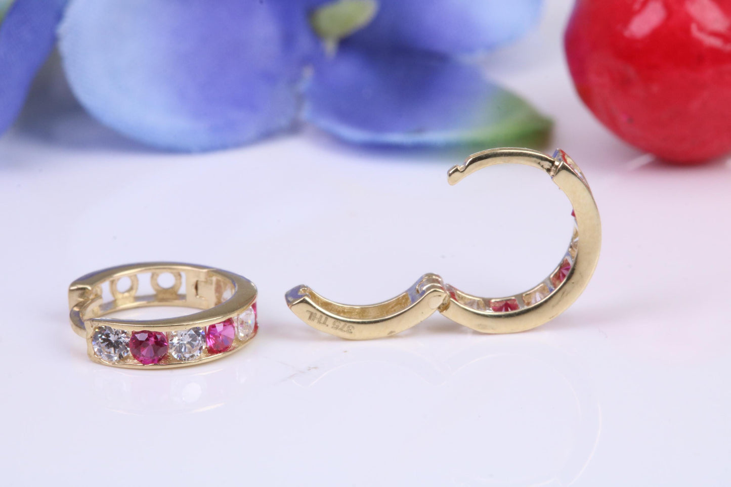 10 mm round hinged hoop earrings, made from solid yellow gold and set with Ruby and Diamond Cubic Zirconia