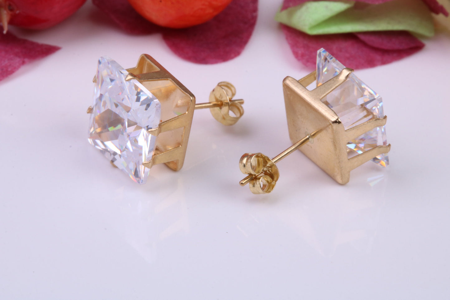 10 mm Square Basket set Cubic Zirconia Stud Earrings, Made from Solid 9ct Yellow Gold, 8 Claw Setting
