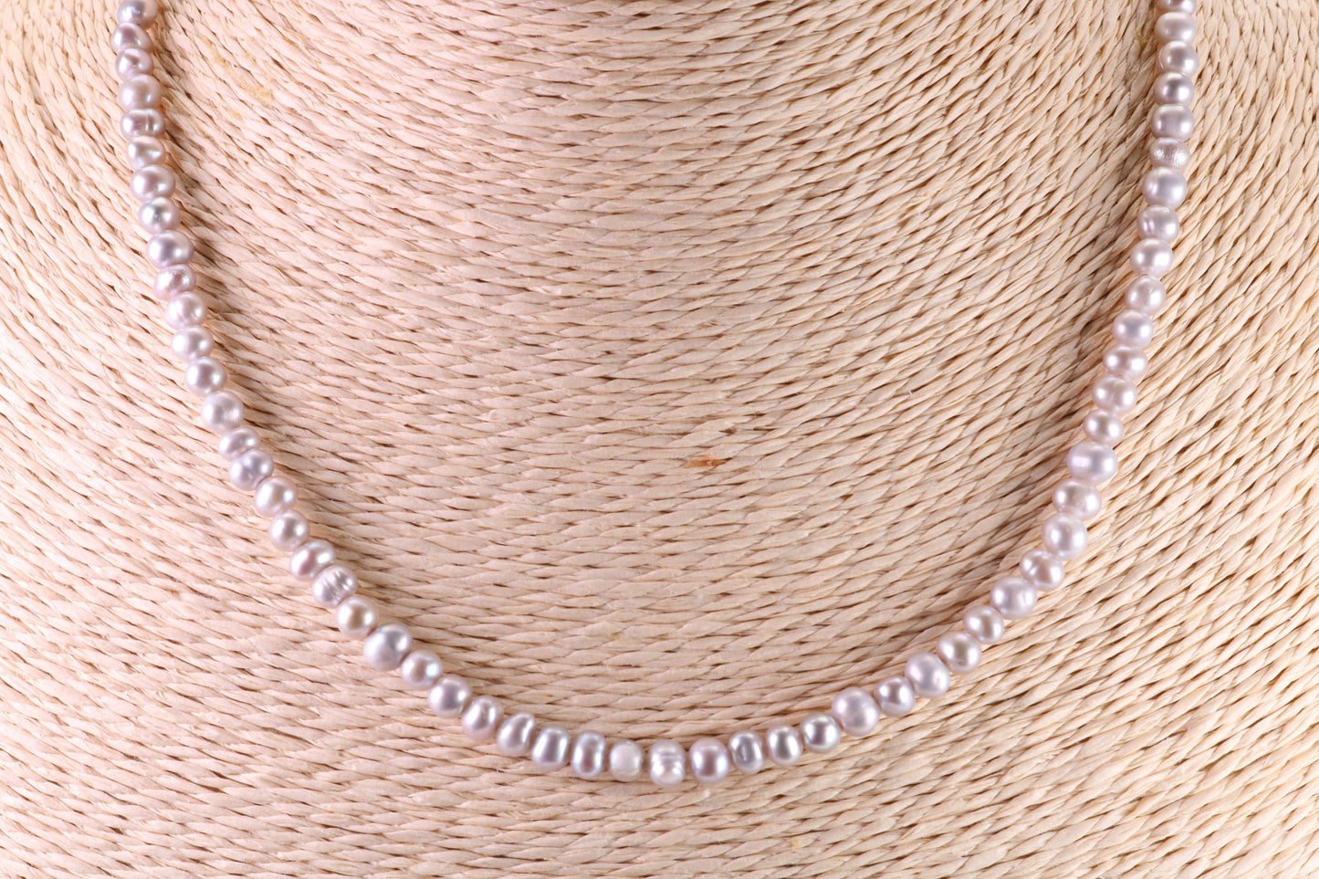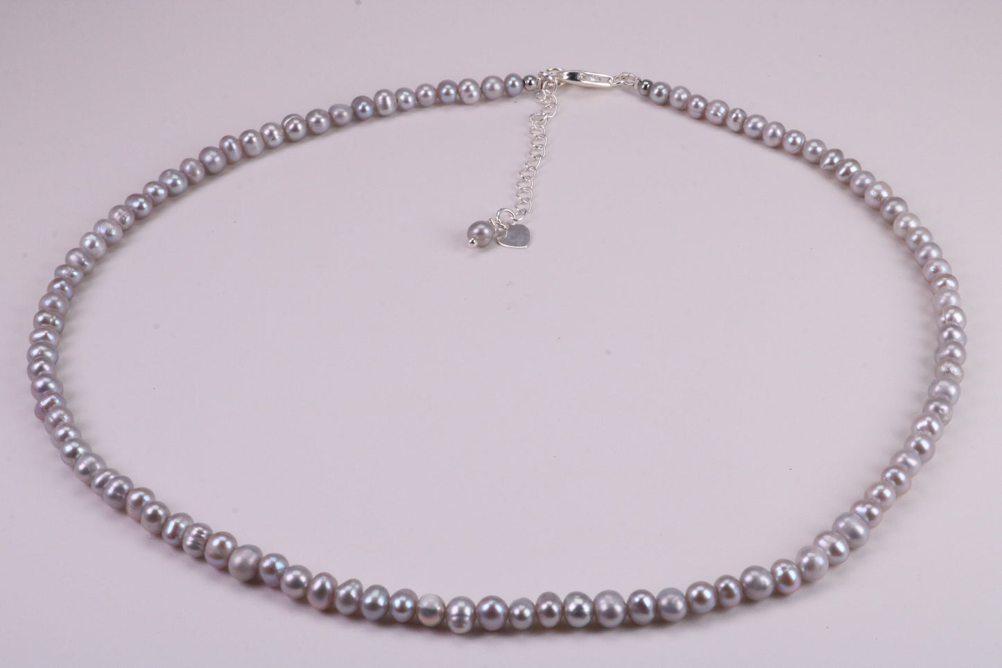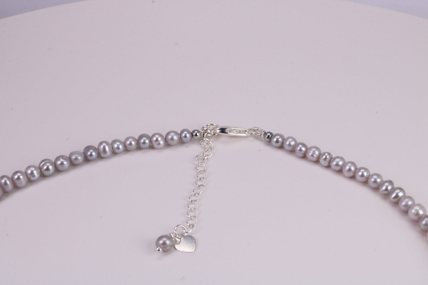 16 Inches Long Single Strand Natural 5 mm Round Grey Pearl Necklace set in Silver