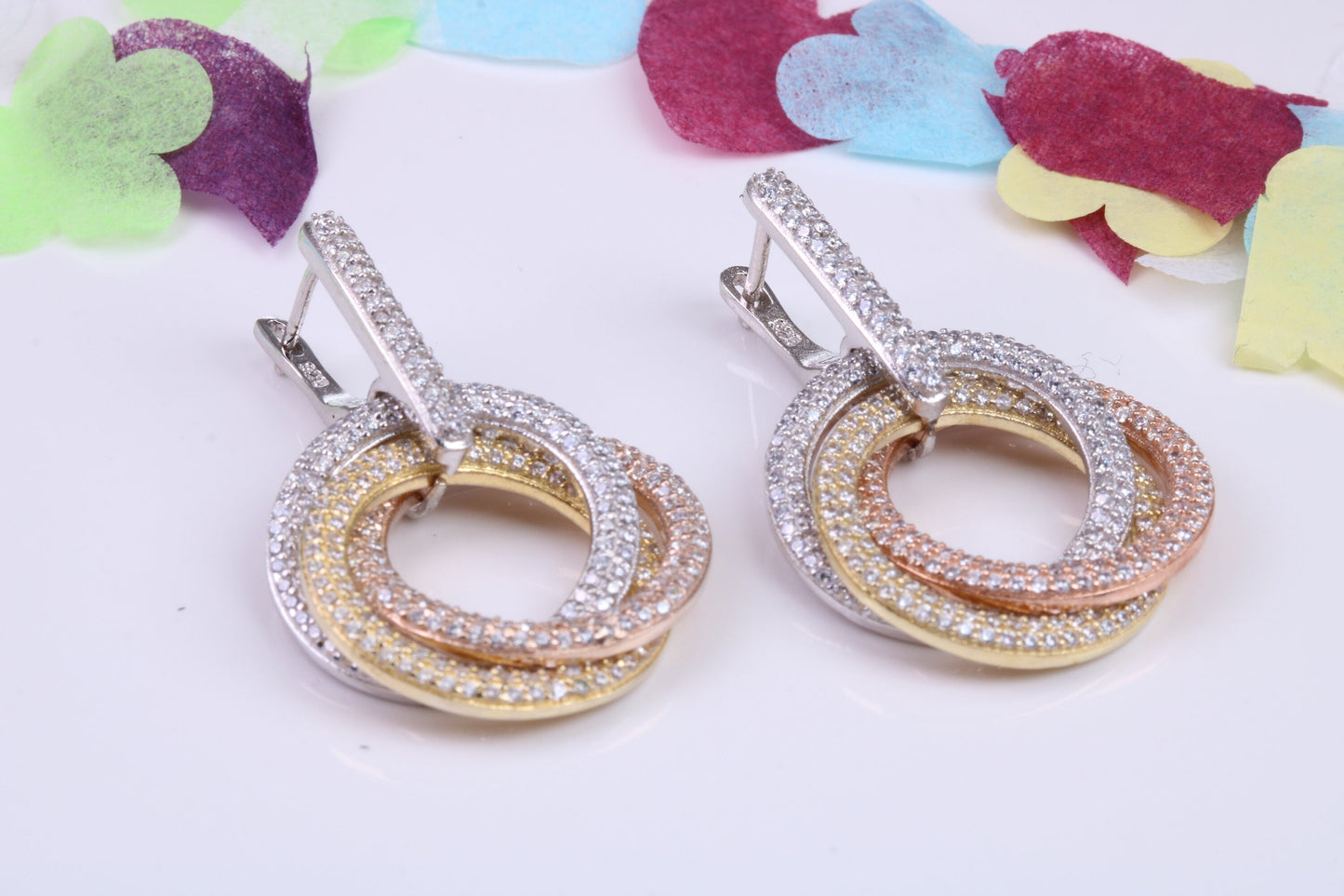35 mm Long Chunky Dropper Earrings, Three Colour Gold Plated, Cubic Zirconia set, Made from Solid 925 Grade Sterling Silver