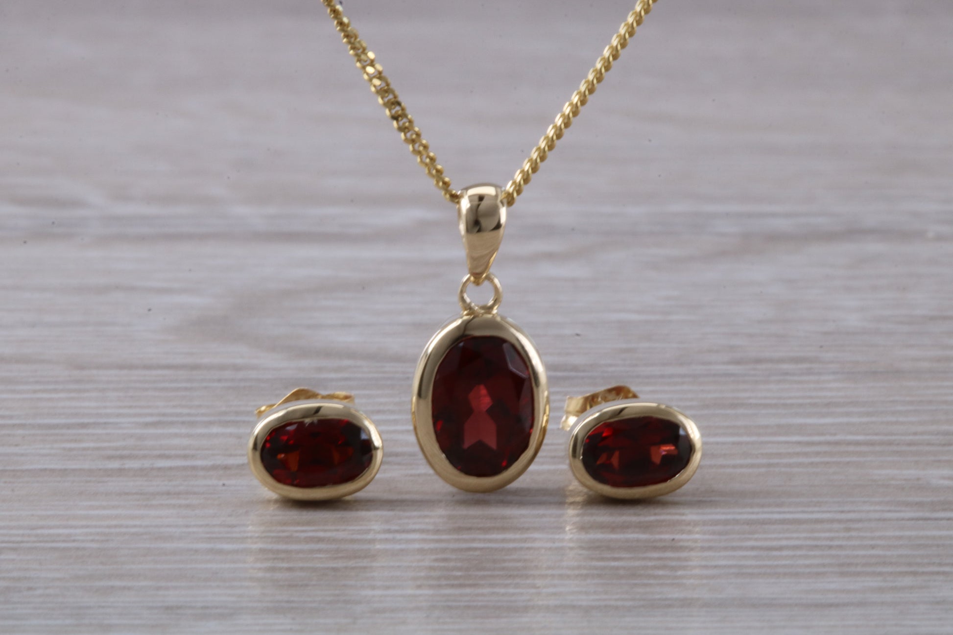Studs are set with 6 x 4 mm Garnet and the Pendant is set with a 8 x 6 mm Garnet