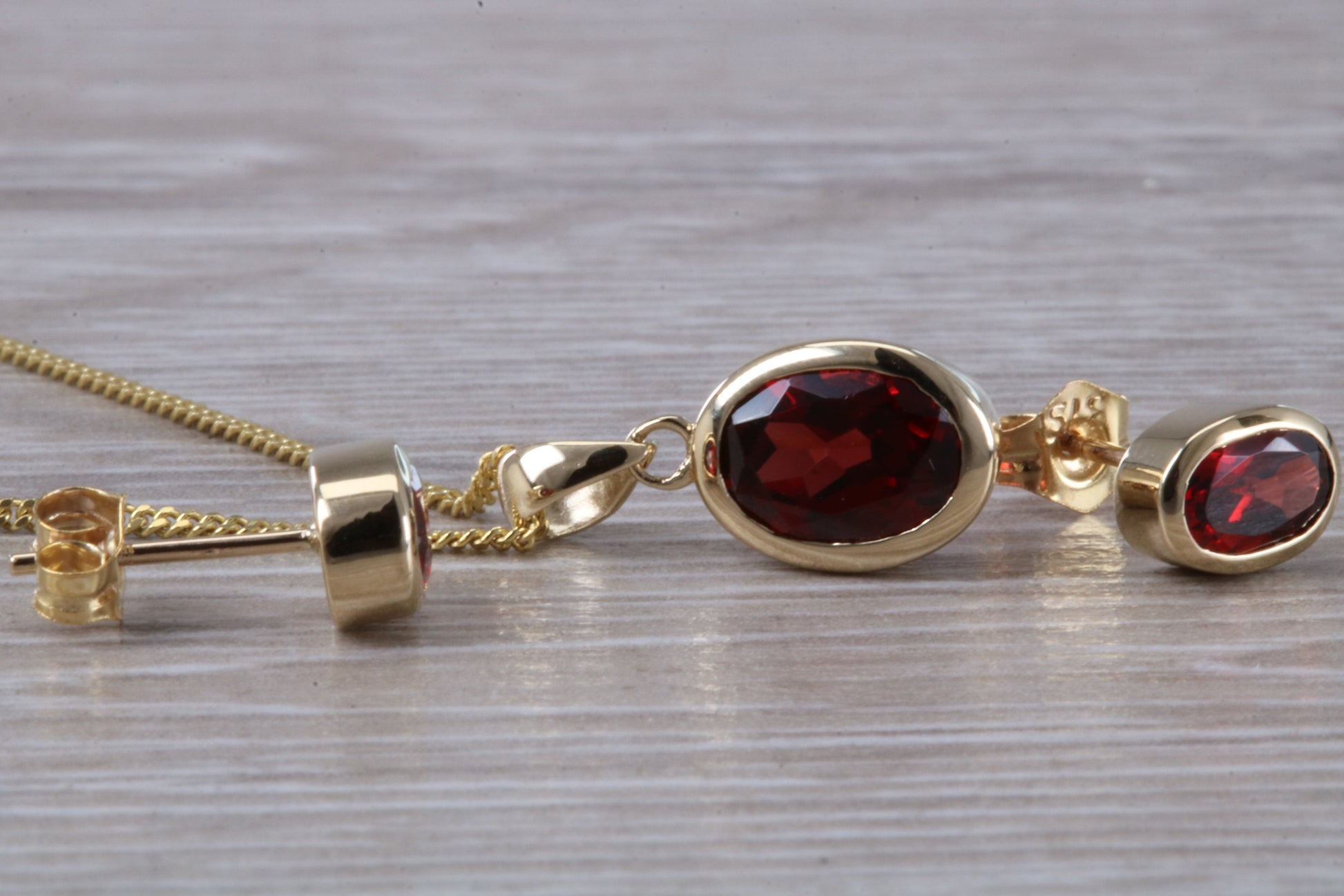 Real Garnet Earrings and Necklace Set, Solid 9ct Yellow Gold