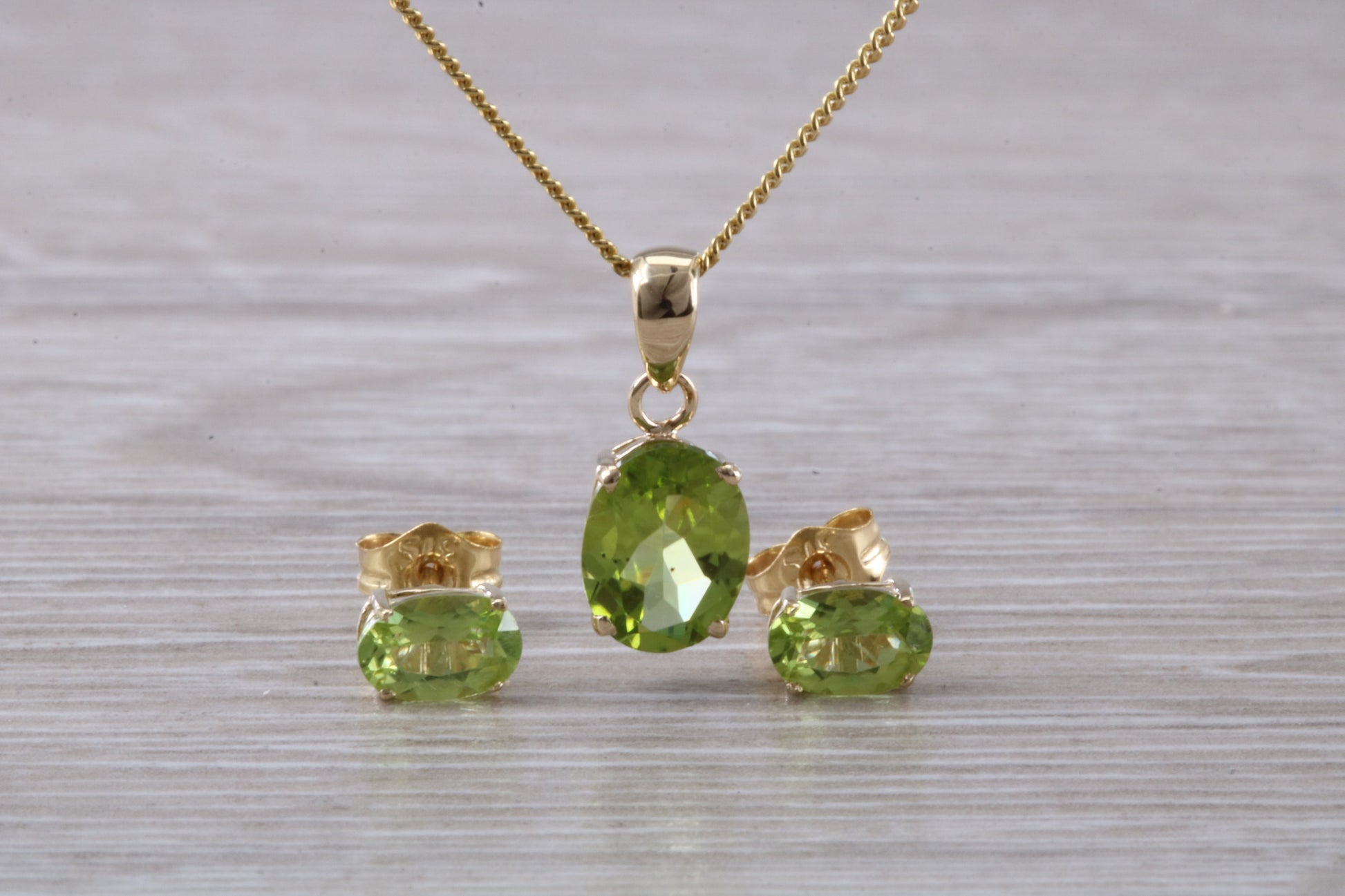 Studs are set with 6 x 4 mm Peridot and the Pendant is set with a 8 x 6 mm Peridot