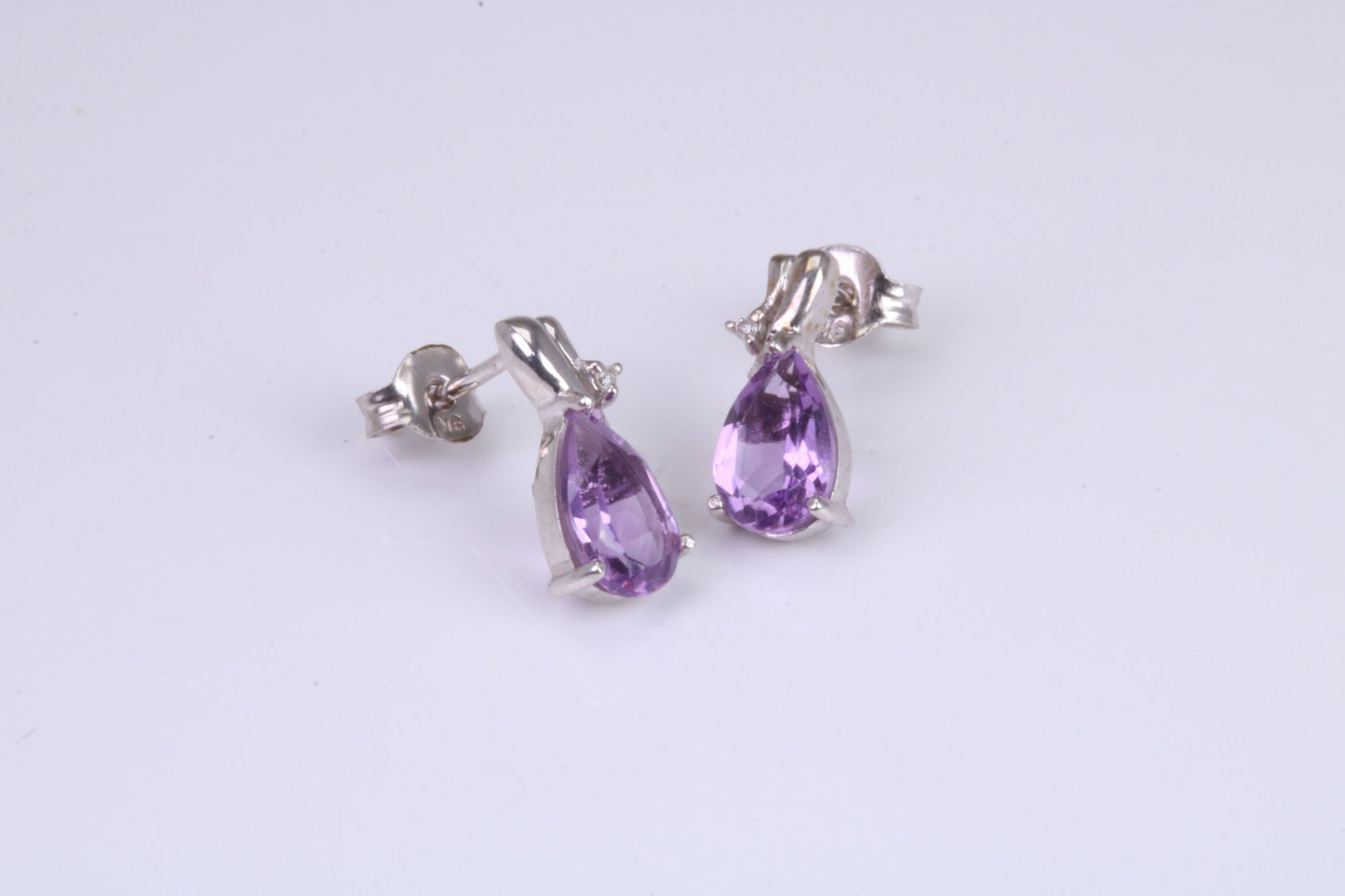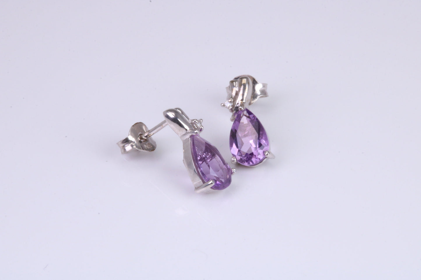 Amethyst and Diamond set Dropper Stud Earrings, Made from Solid White Gold