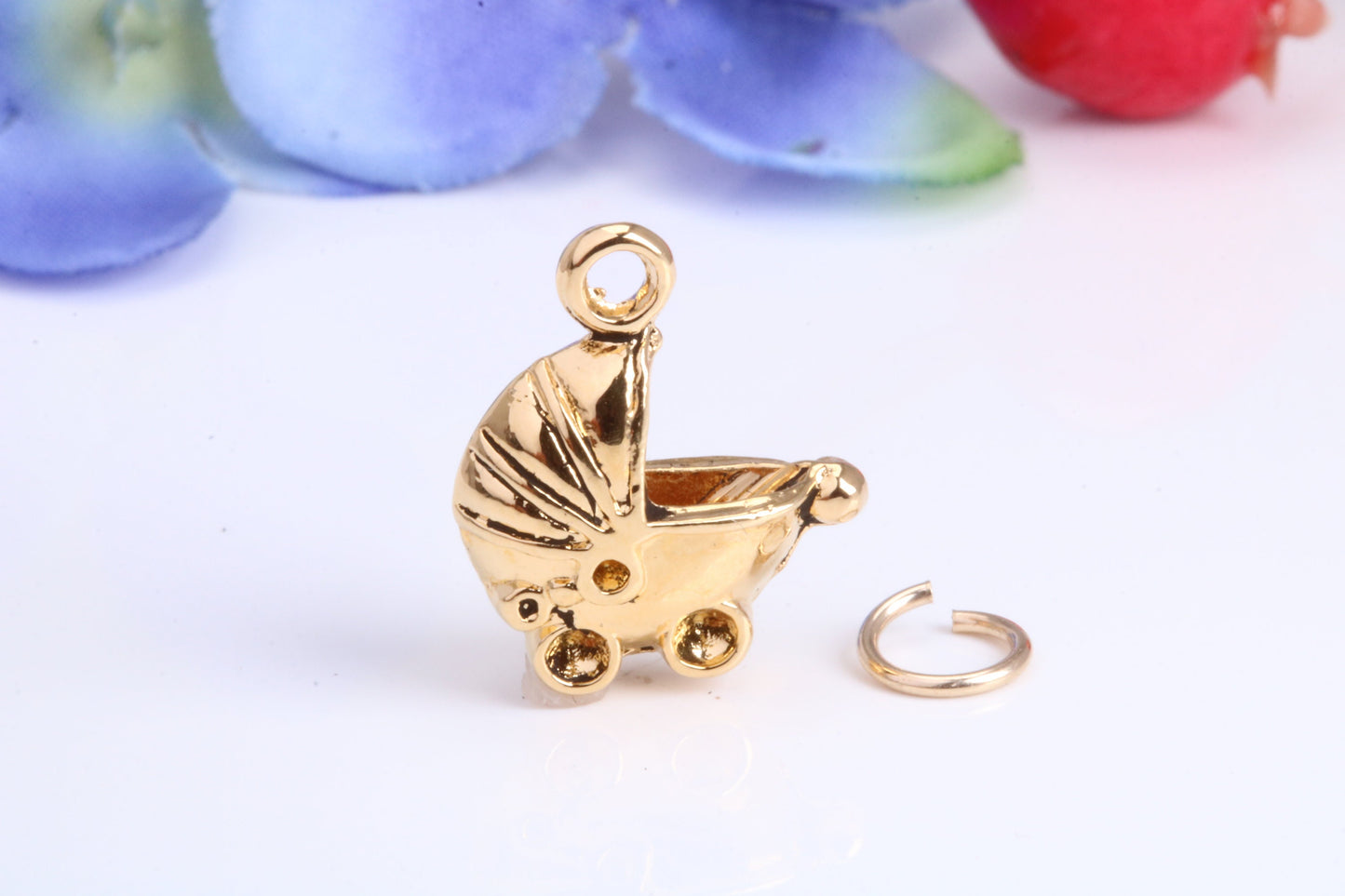 Baby Pram Charm, Traditional Charm, Made from Solid Cast Yellow Gold, British Hallmarked