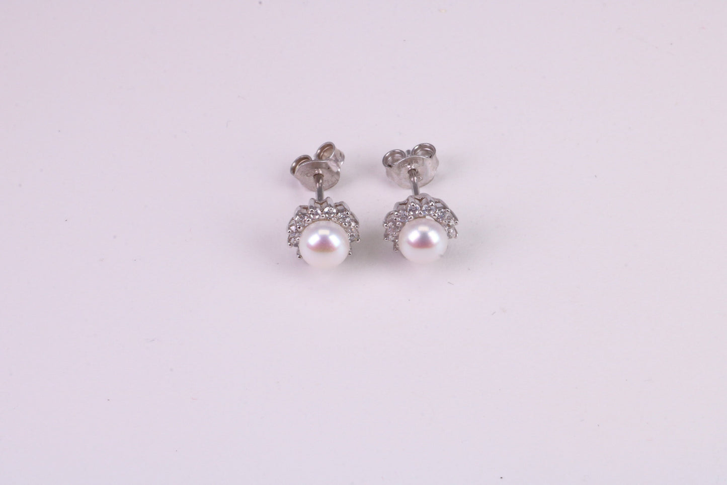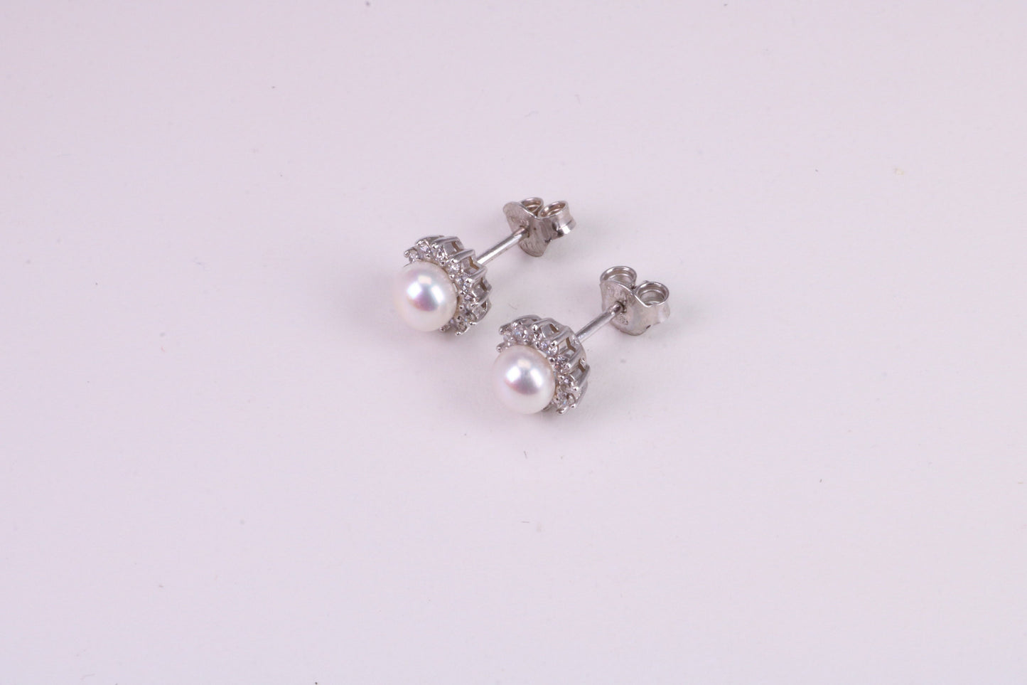 Dainty 8 mm Round Natural Pearl and Cubic Zirconia set Stud Earrings, set in Solid Silver