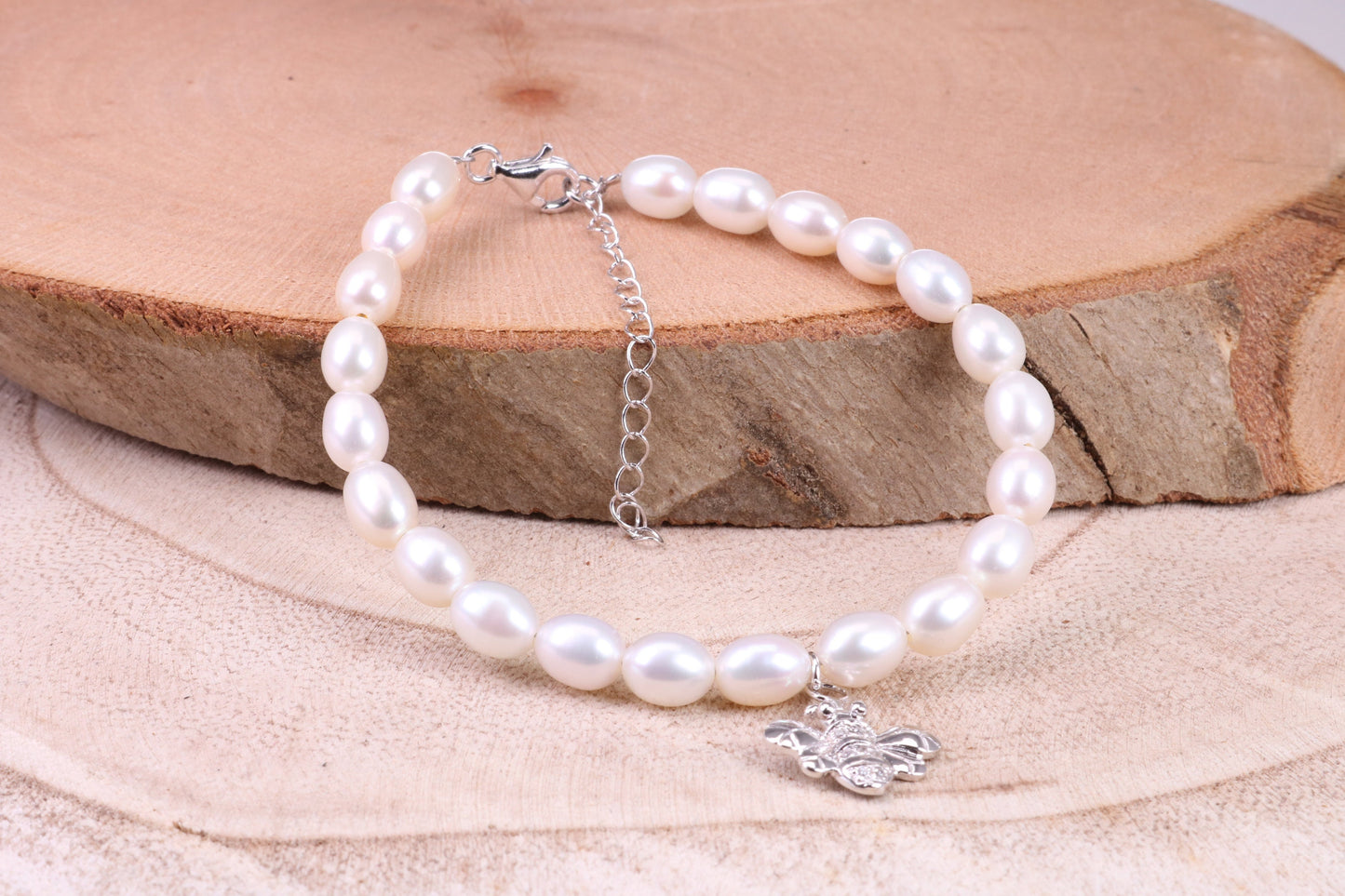 Freshwater Pearl Bracelet with Bumble Bee Charm Dropper, made from Sterling Silver