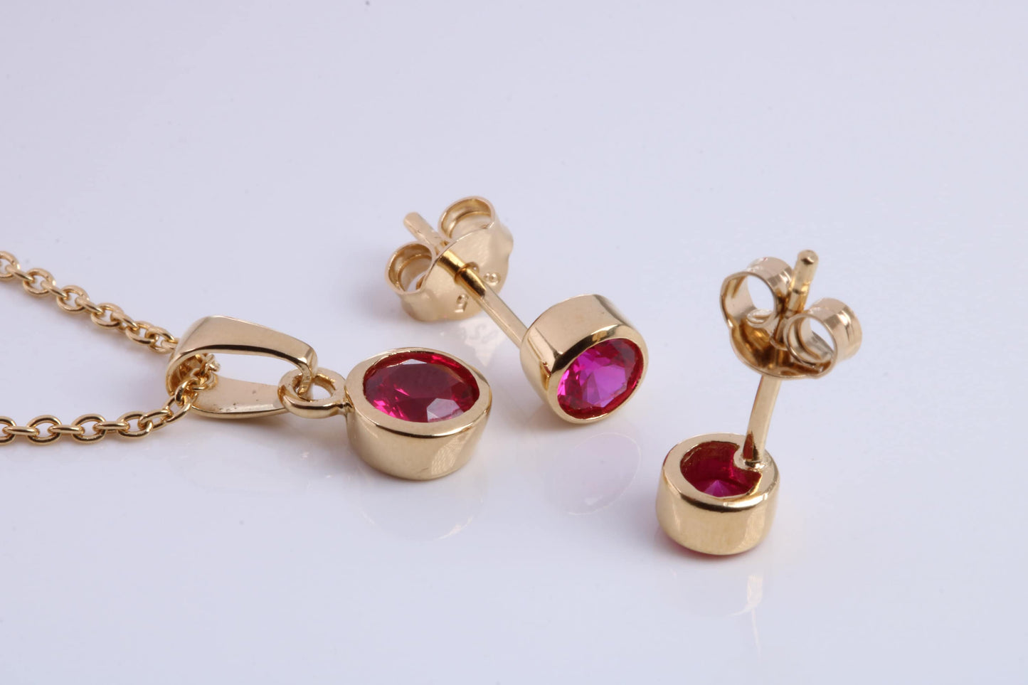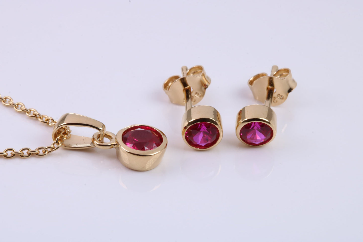 July Ruby C Z set Necklace and Matching Stud Earrings, made from solid Sterling Silver and 18ct Yellow Gold Plated