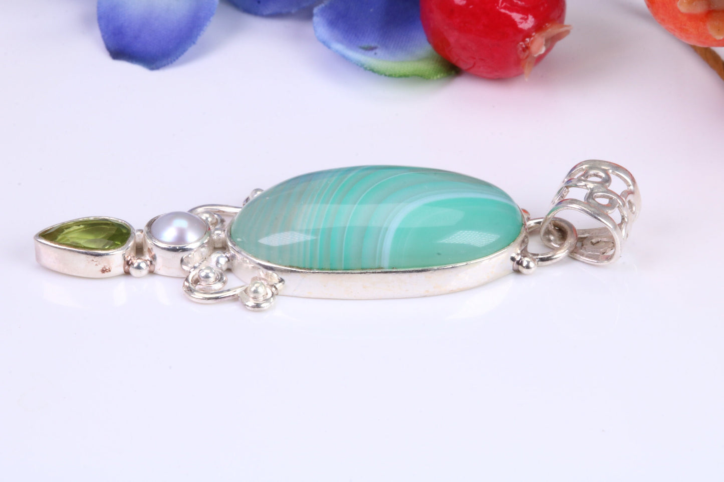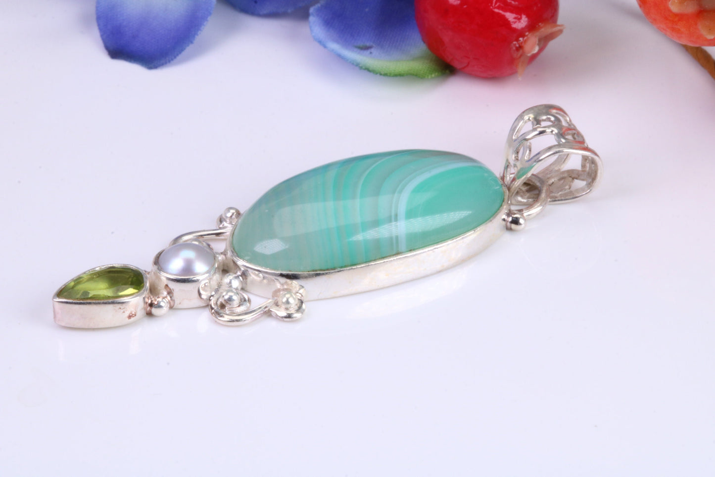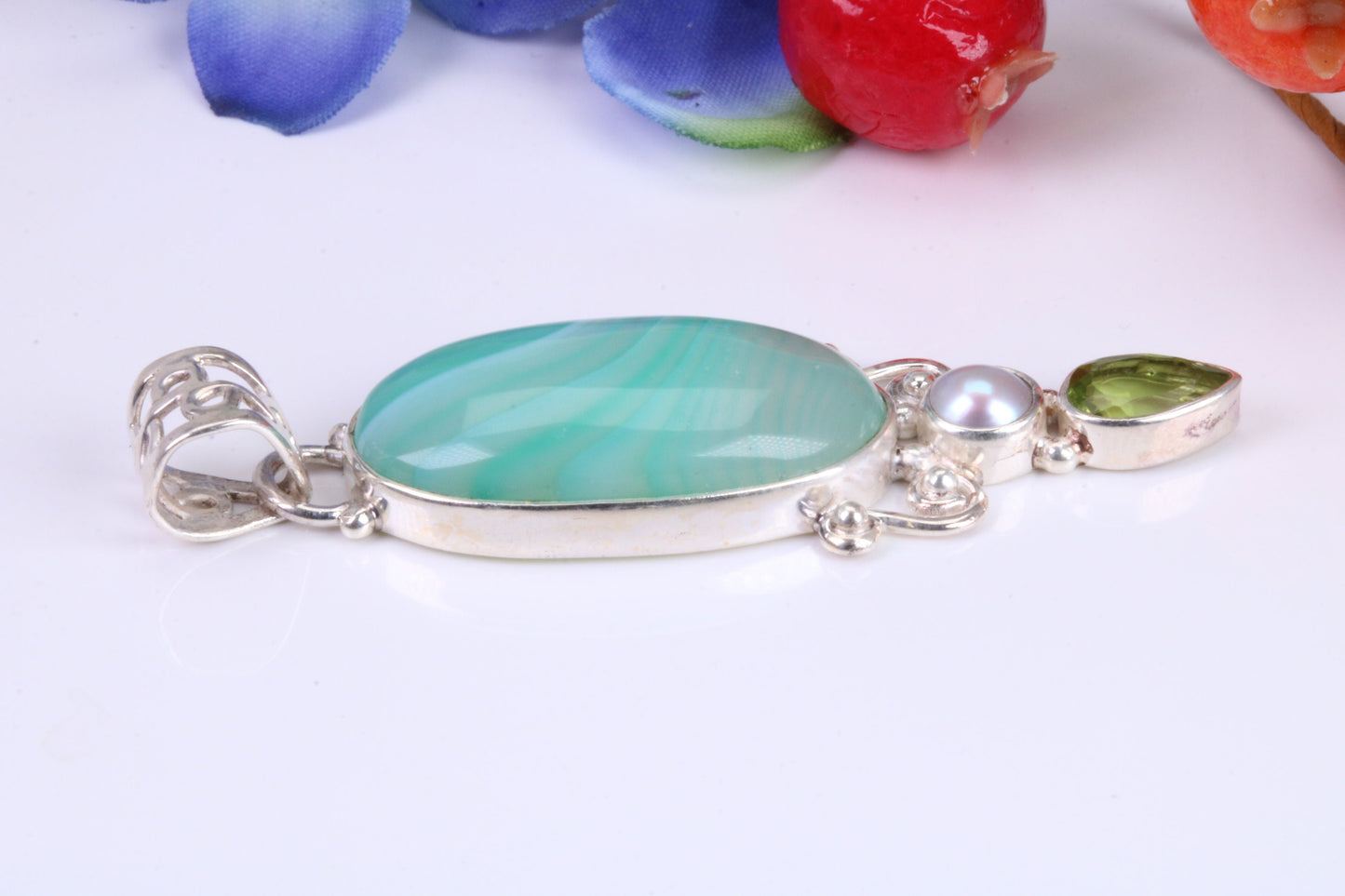 Large Green Agate, Peridot and Pearl Pendant in Sterling Silver