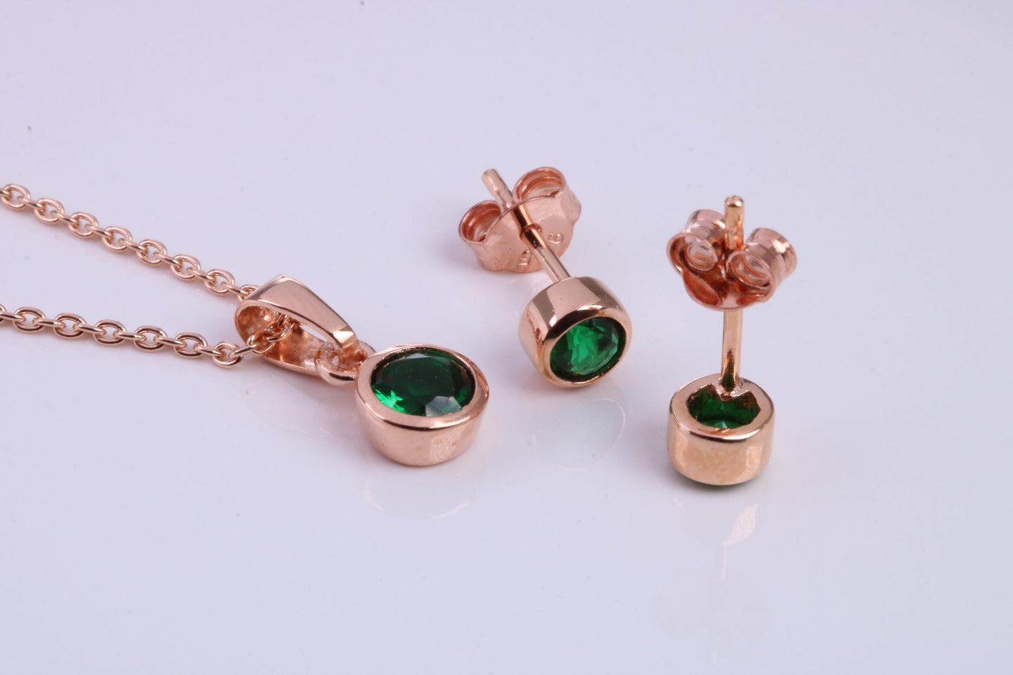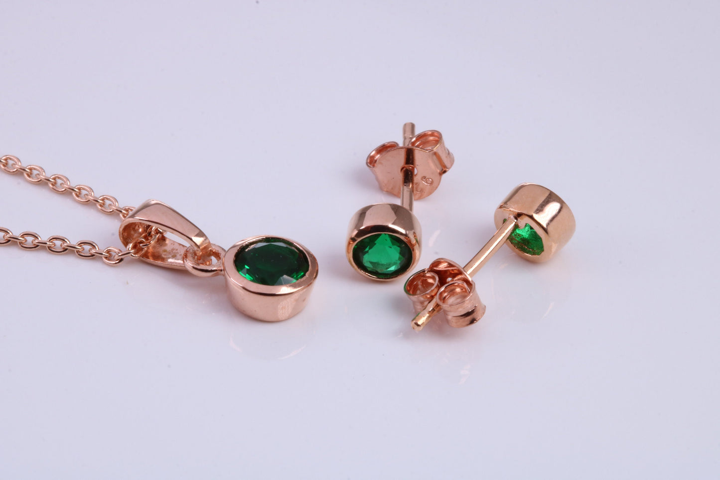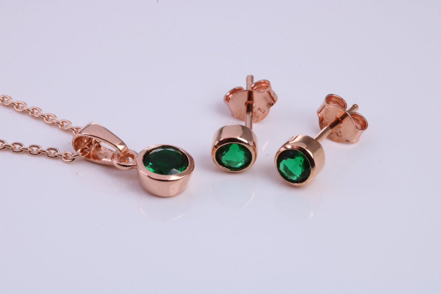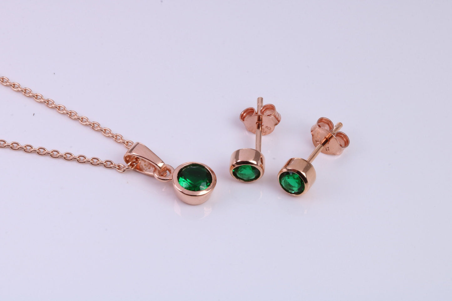 May Emerald C Z set Necklace and Matching Stud Earrings, made from solid Sterling Silver and 18ct Rose Gold Plated