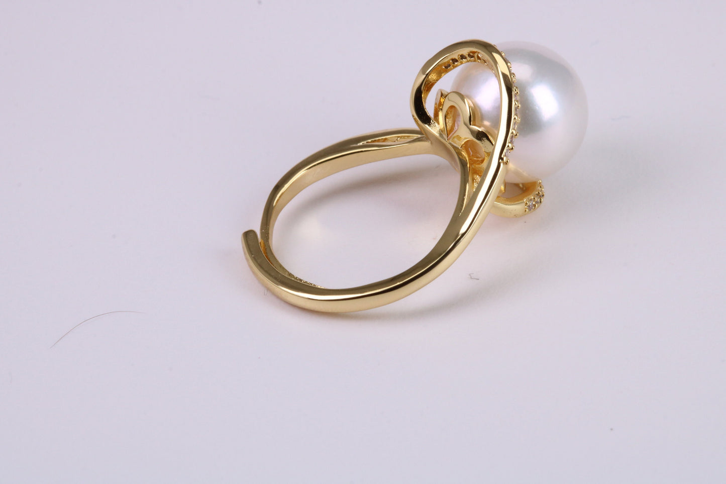 Natural 11 mm Round Pearl and Cubic Zirconia set Ring set in Solid Silver and Further 18ct Yellow Gold Plated