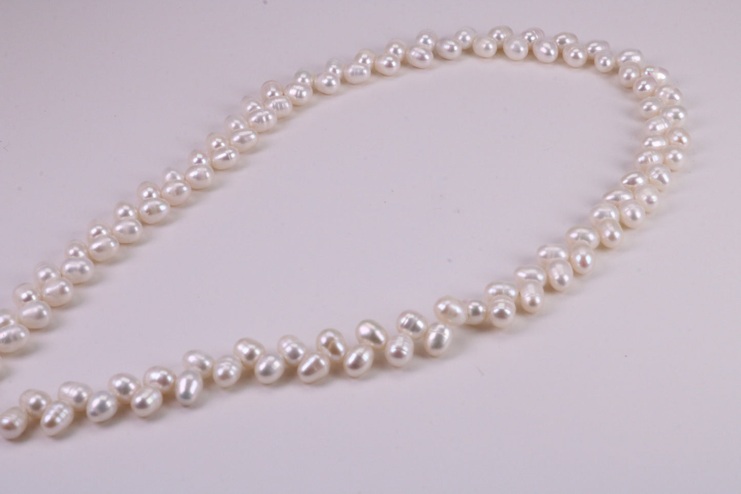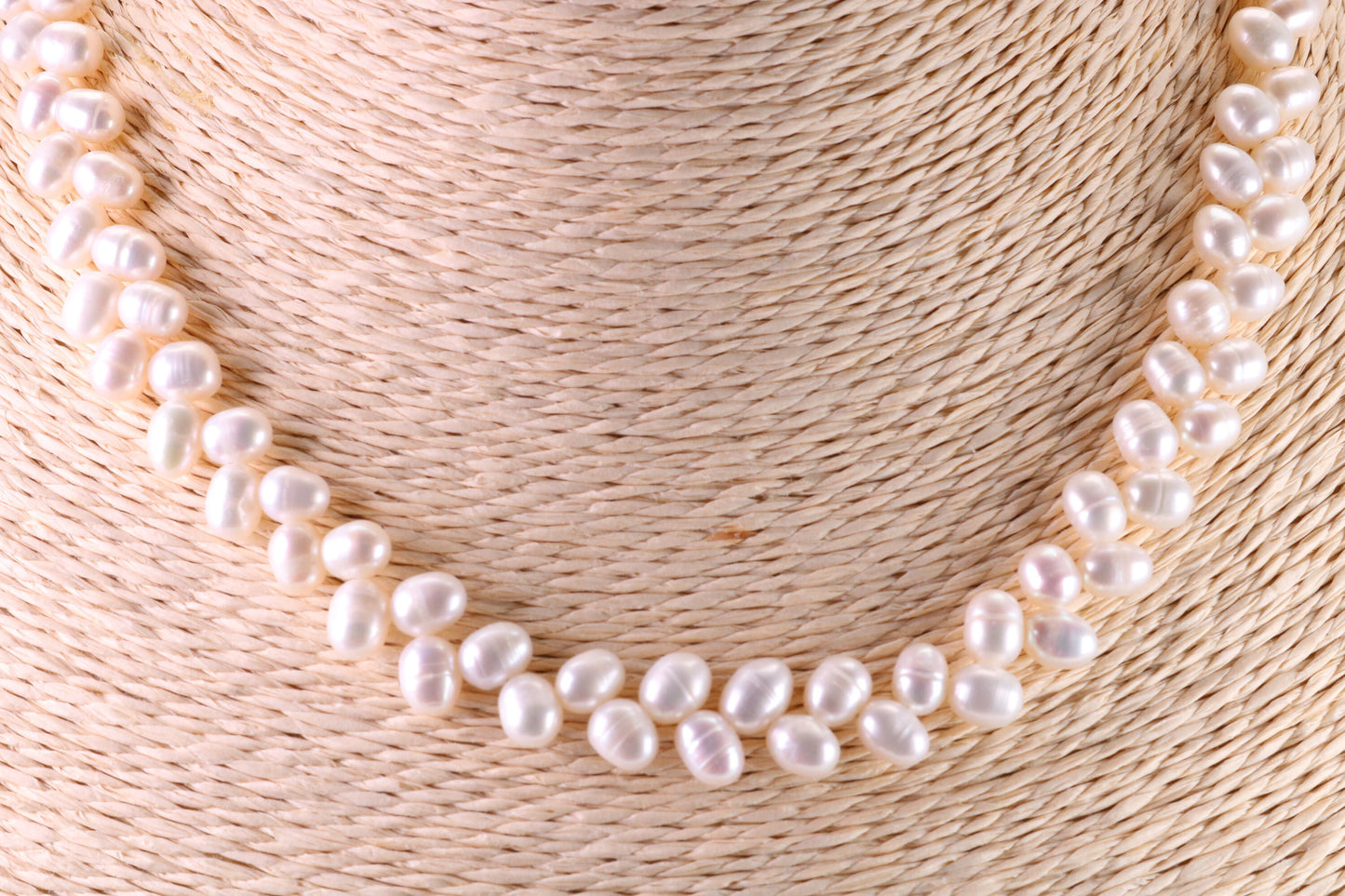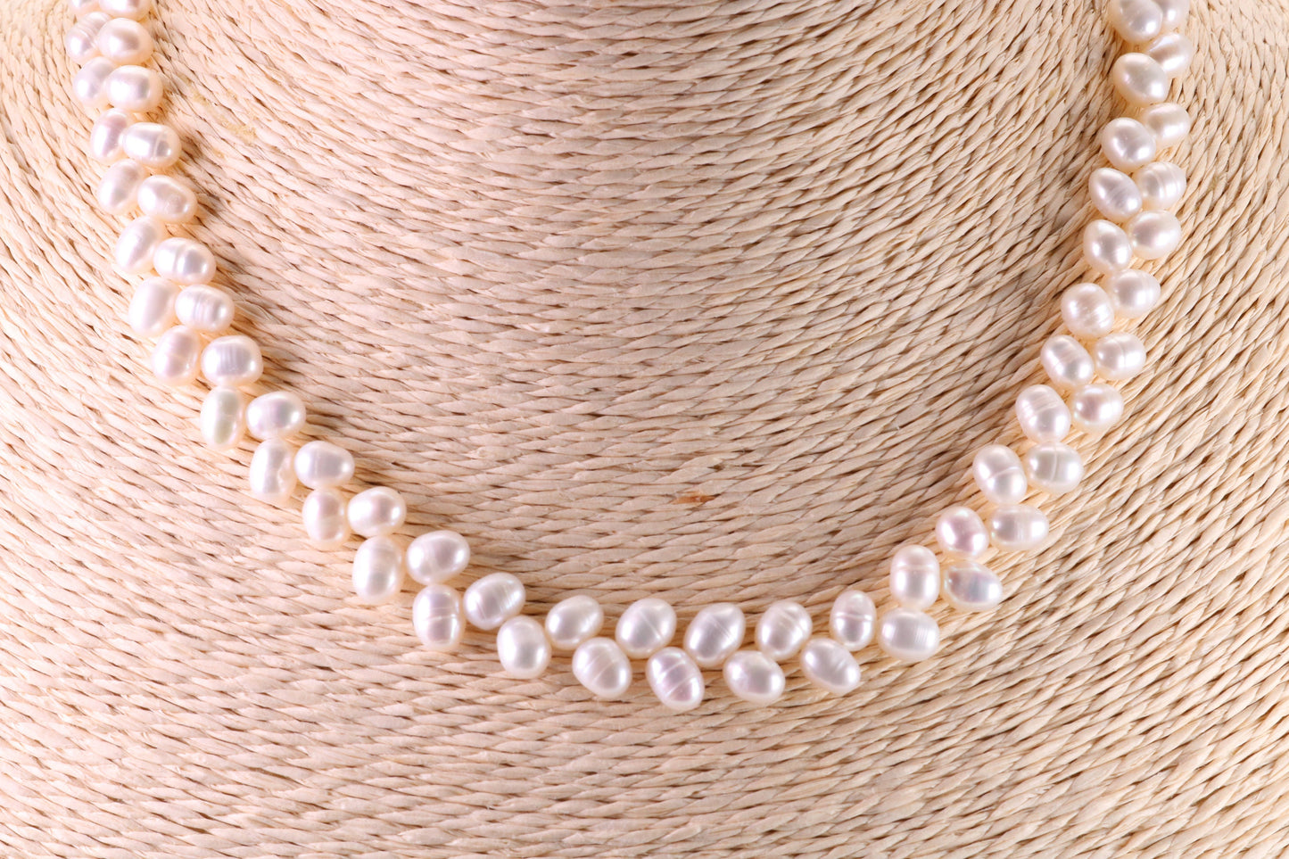 Natural 5 mm Rice Pearl Necklace set in Silver, Double Stranded and Measures 16 inches Long