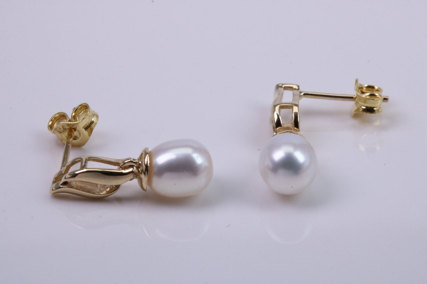 Natural Freshwater Pearl Stud Dropper Earrings set in Solid Yellow Gold