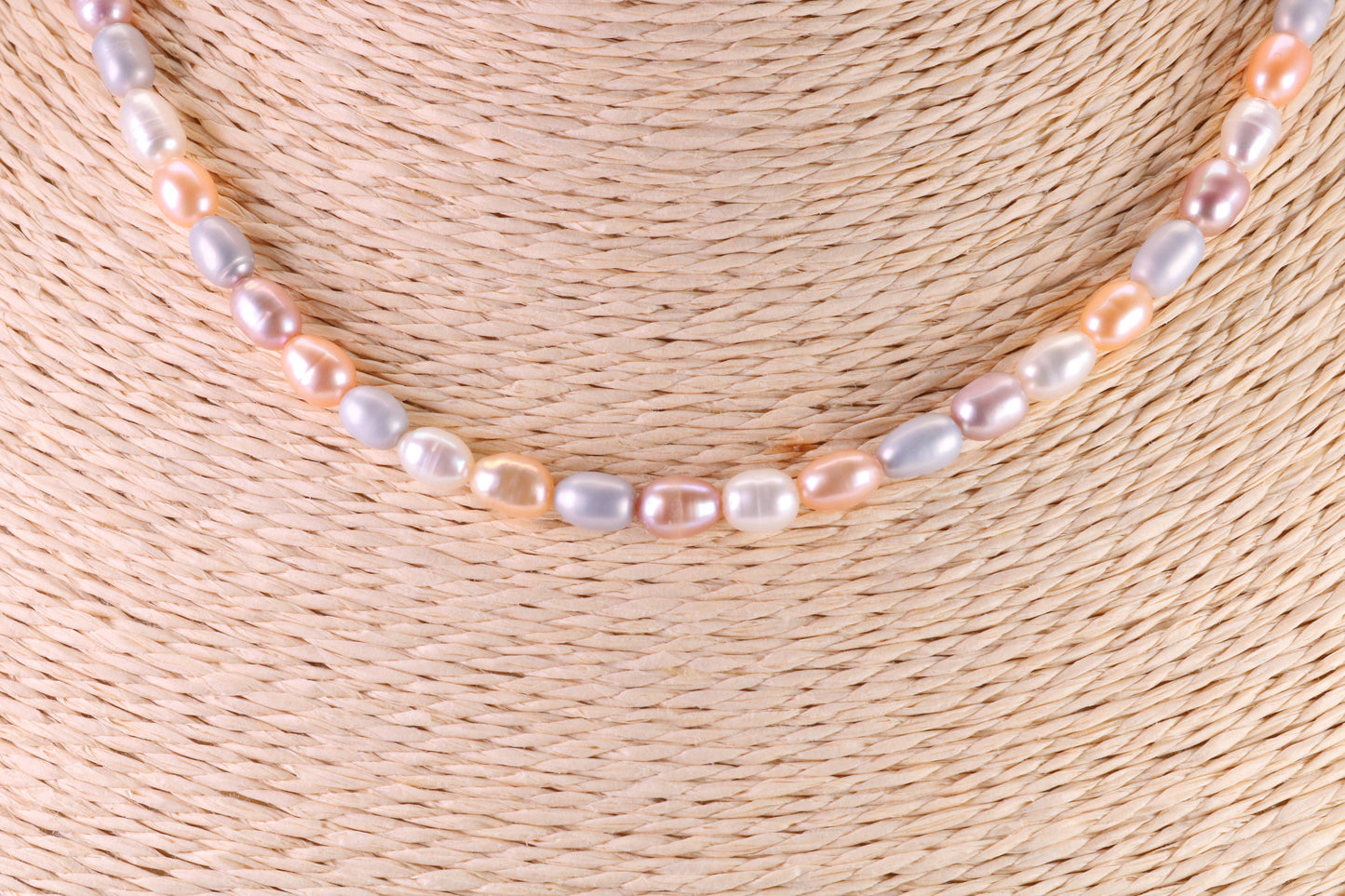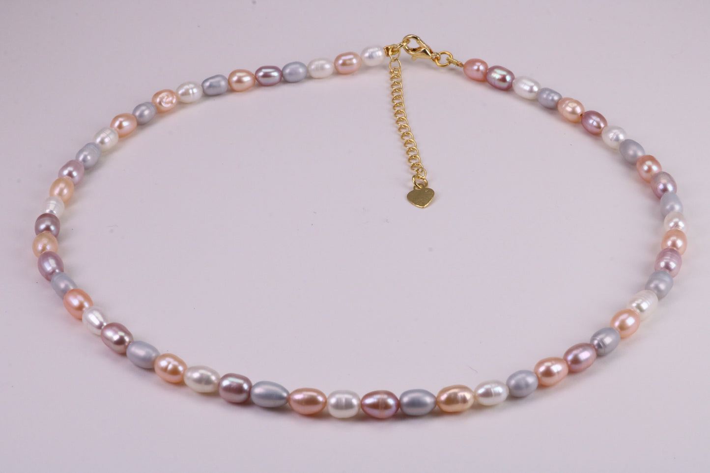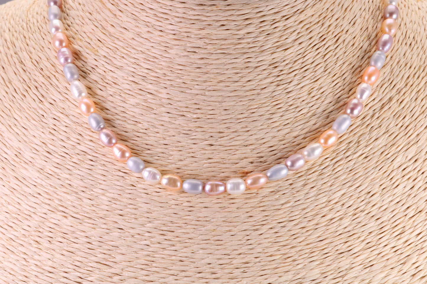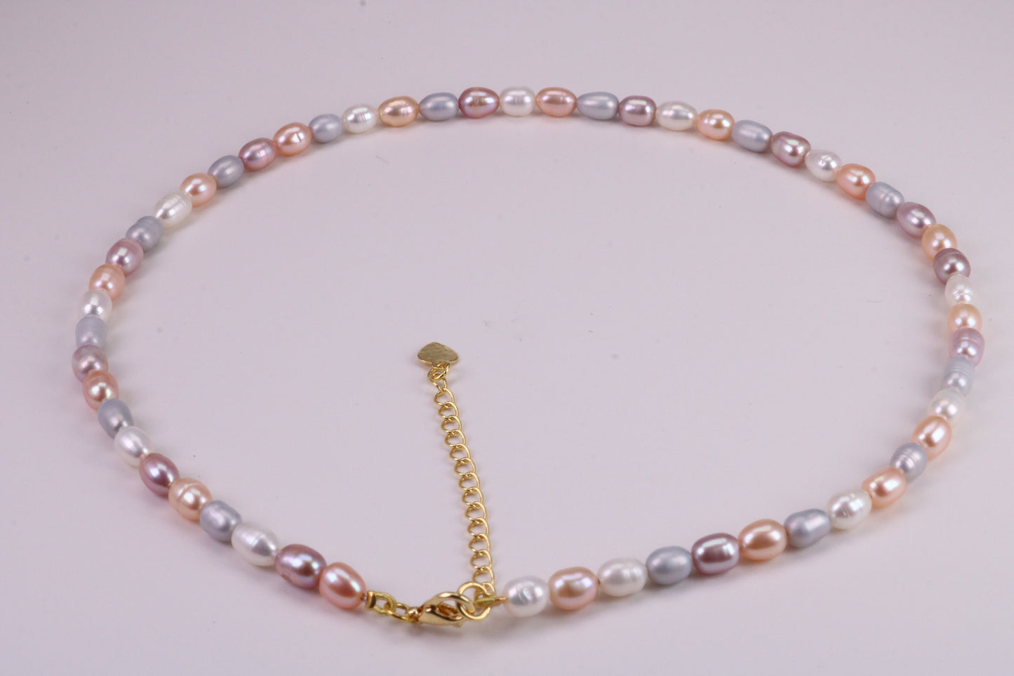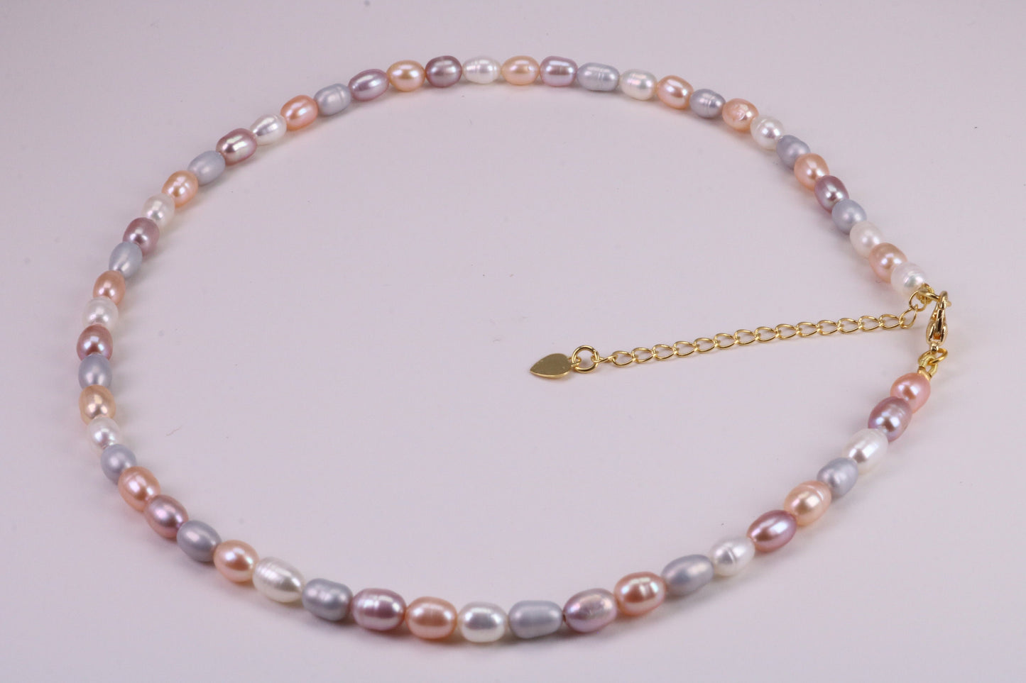 Natural Pastel Coloured 16 Inches Long Single Strand Pearl Necklace set in Silver, 5 mm Oval Pearls, Length Adjustable Necklace