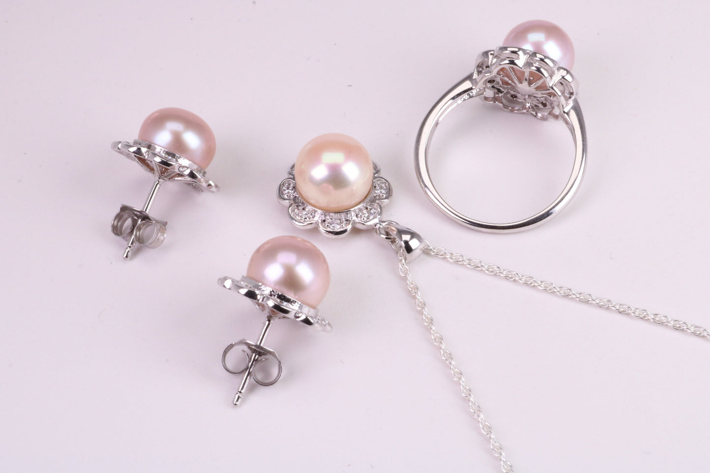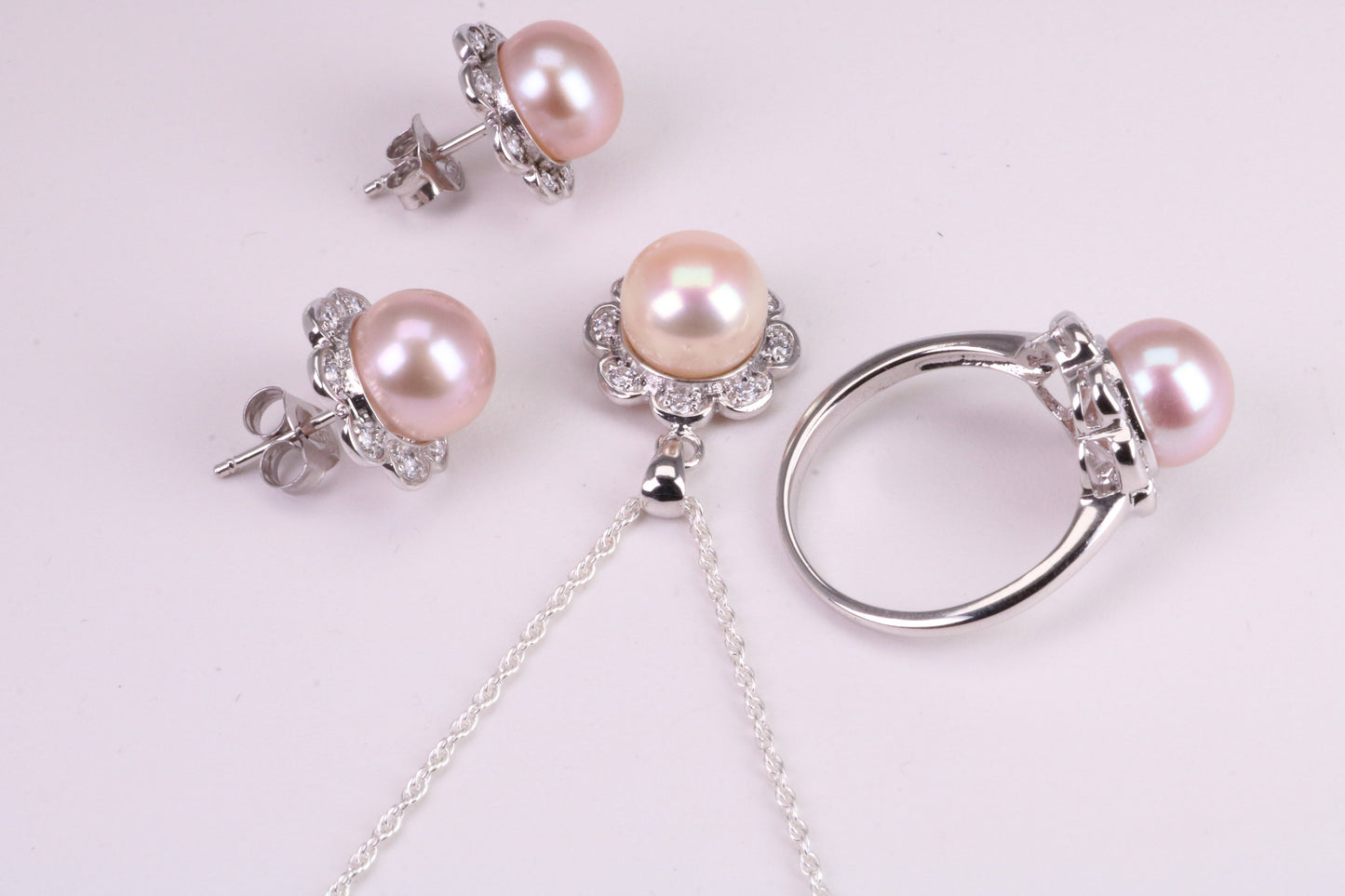 Natural Pearl and Cubic Zirconia set Necklace, Ring and Matching Earrings, set in Solid Silver