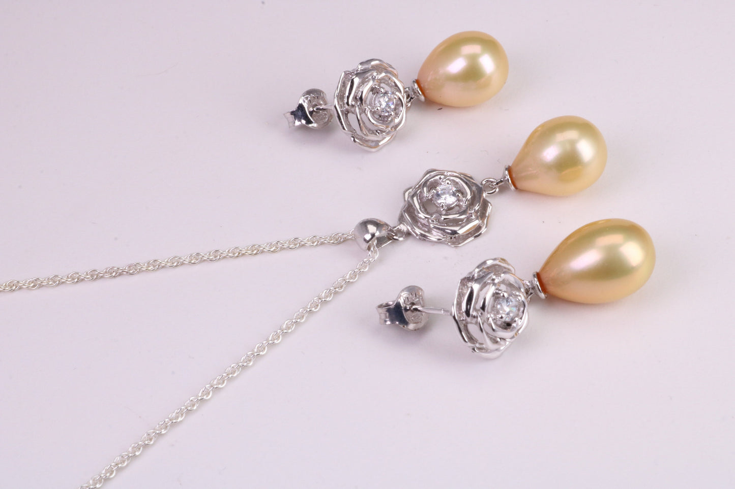Yellow Pearl and Cubic Zirconia set Necklace with matching Earrings