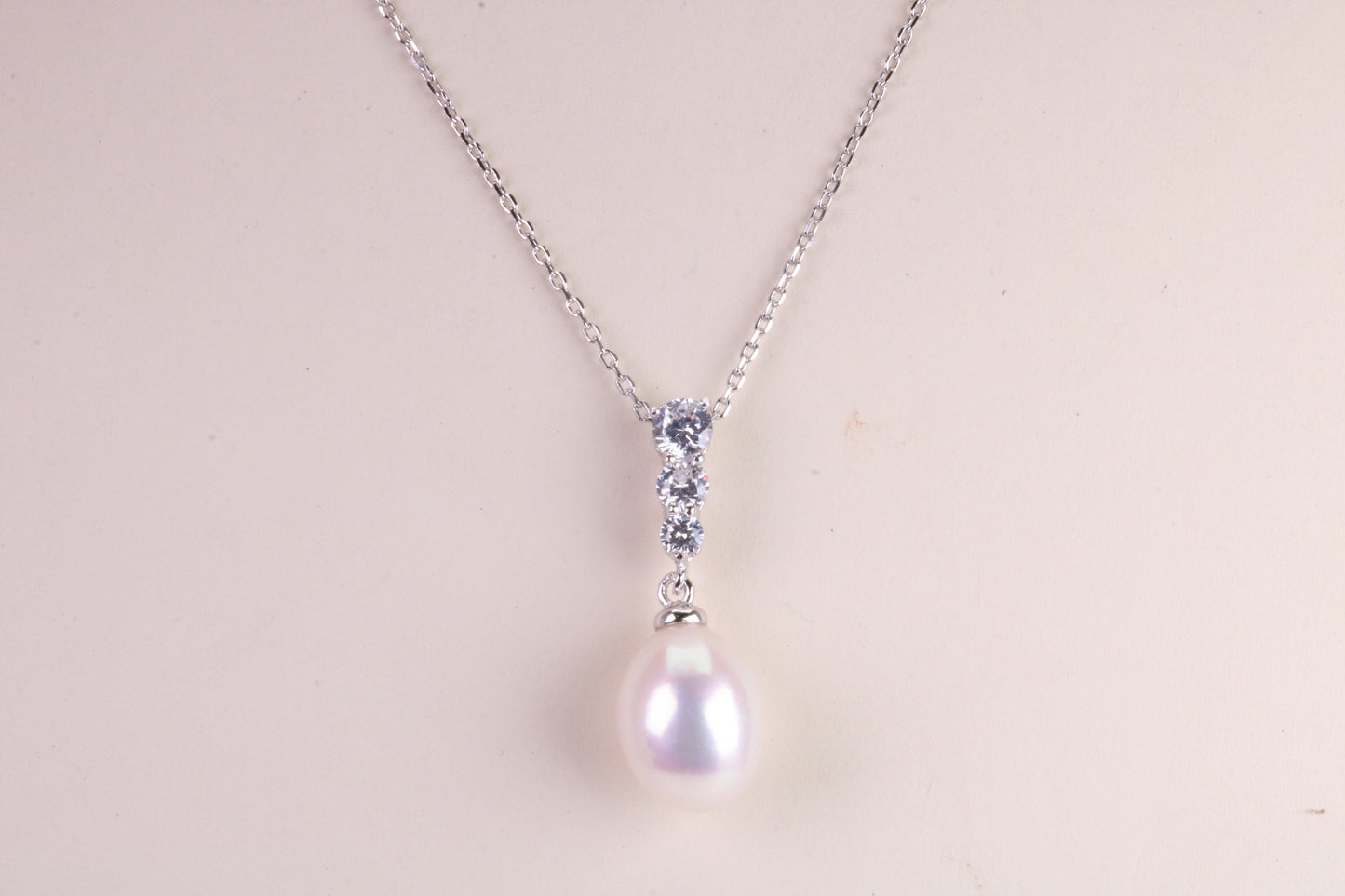 Natural Pearl and Cubic Zirconia set Necklace set in Solid Silver, 18ct Yellow Gold Plated, Length Adjustable Chain