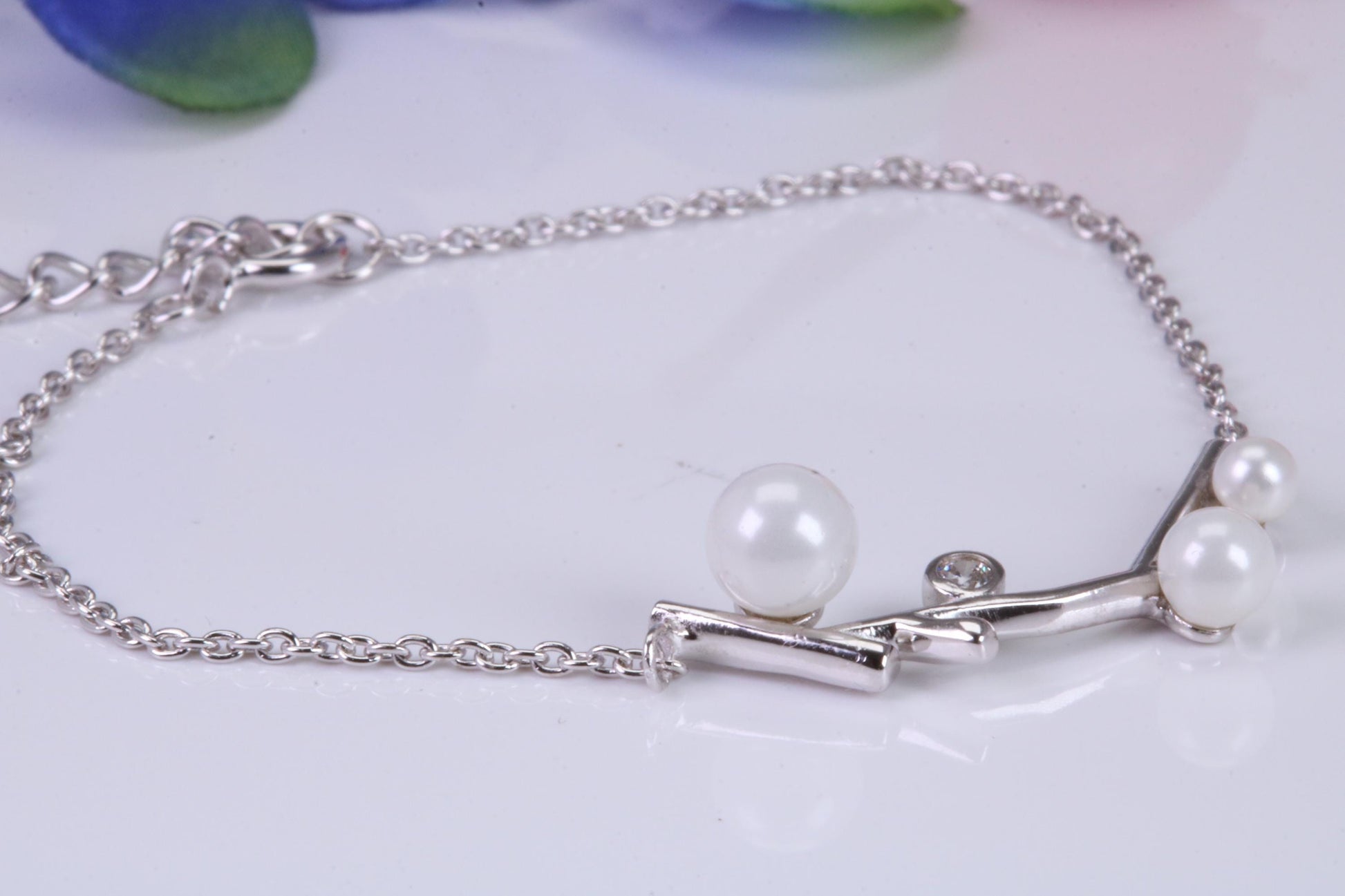 Pearl and C Z set Bracelet, With Length Adjustable Chain, Made from solid Sterling Silver