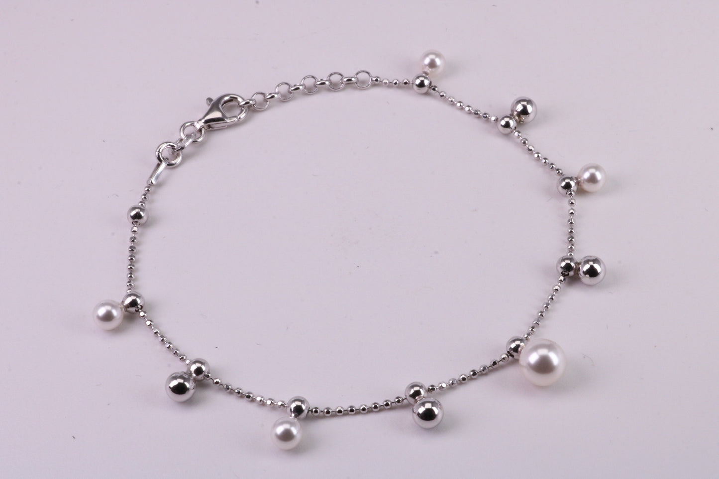 Pearl and Plain Bead Bracelet, With Length Adjustable Chain, Made from solid Sterling Silver
