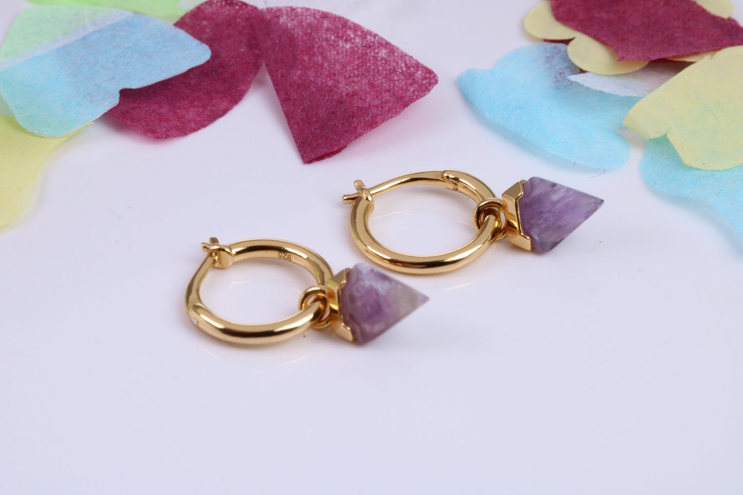 Real Amethyst set Dropper Hoop Earrings, Cubic Zirconia set, Made from Solid 925 Grade Sterling Silver, 18ct Yellow Gold Plated